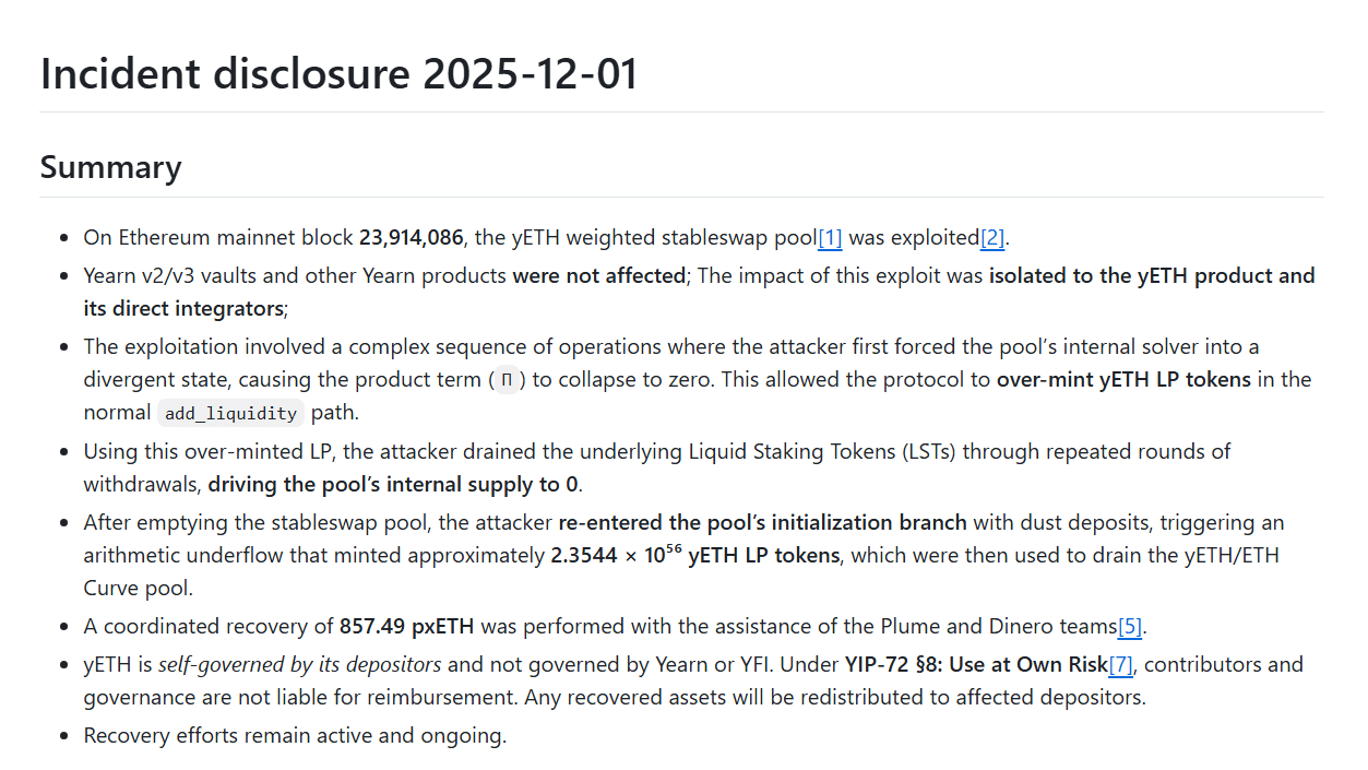 In the report, Yearn said the attack hit the yETH weighted stableswap pool at block 23,914,086 on November 30, 2025.