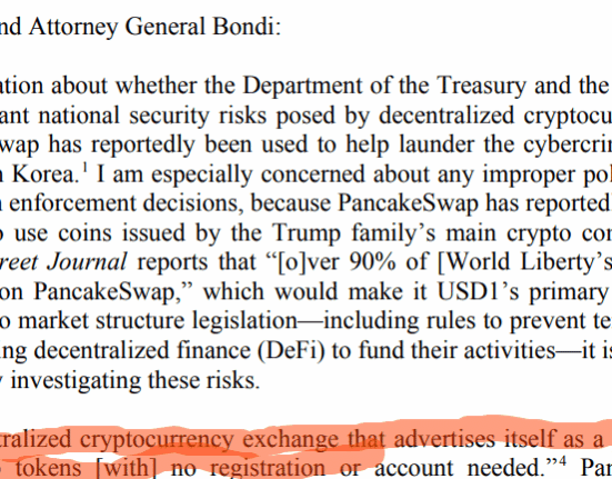 Elizabeth Warren presses Treasury and DOJ on national security risks from DeFi, singling out PancakeSwap and Trump-linked World Liberty Financial as Congress stalls on crypto market rules.